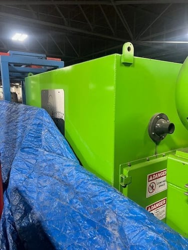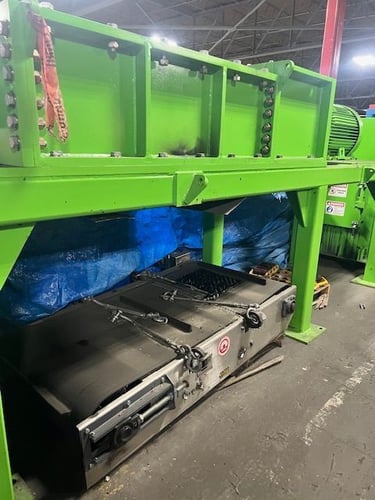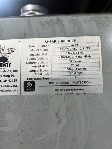 Komar Industries ES-5236-150 Twin Shaft Shear Shredder features counter-rotating, anti-jam drive with high strength steel alloy shafts and replaceable double-keyed cutters. Equipped with 150 HP (112 kW) Toshiba electric motor, 480VAC 3-Phase 60Hz power, and a standalone Komar control panel with PLC, safety relays, and hour meter showing approximately 1,328 hours. Includes infeed hopper and under-shredder discharge conveyor. The 52" x 36" infeed charge opening handles a wide range of materials including wood waste, pallets, drums, plastic, tires, e-waste, and general plant waste. Features Komar's patented Pro Cutter Locking System and Proprietary Bearing Protection System for extended uptime and lower operating costs.